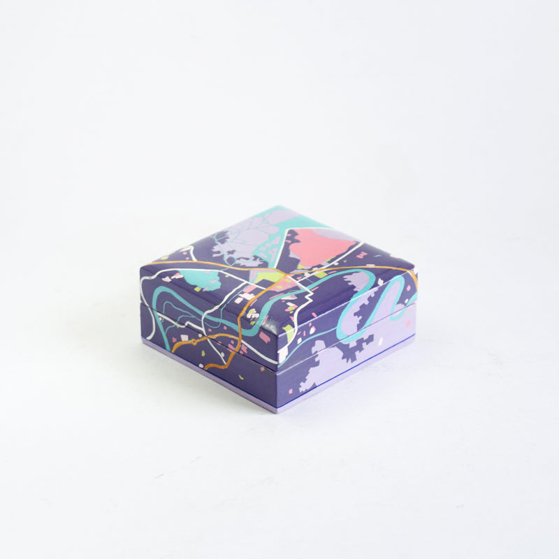 The 'Srinagar Collection' Small Keepsakes Box is designed and developed with traditional Kashmiri Naqqashi artisans. The coloured map of Srinagar city is hand-painted in a vibrant palette inspired by the season of almond blossoms in Srinagar.